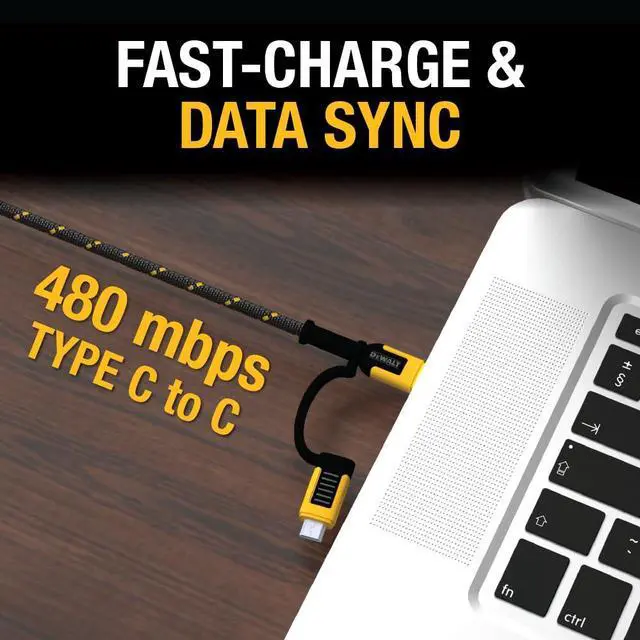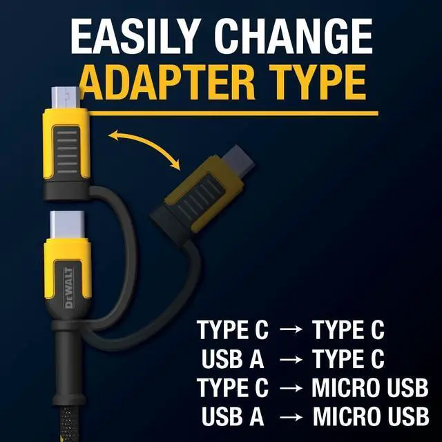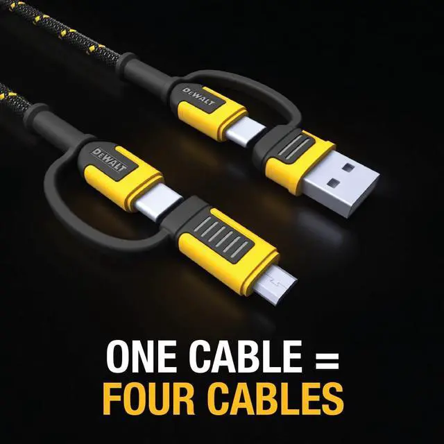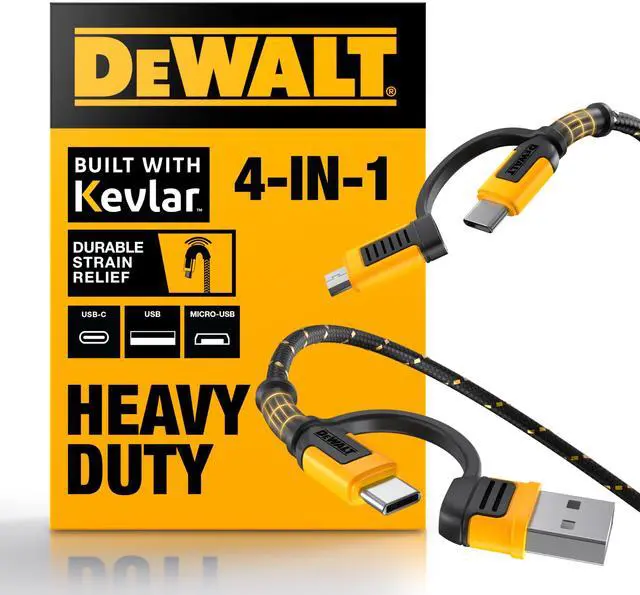 DEWALT Heavy Duty 4-in-1 Cable, Type C/MicroUSB/USB Cables for iPhone 17/16/15 iPad, USBC All in One Charging Cable, HTC, LG, Samsung Galaxy, Android, iPad Pro, Micro-to-C Charger Cables (6ft, Black)