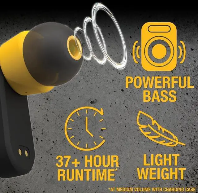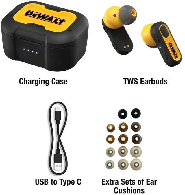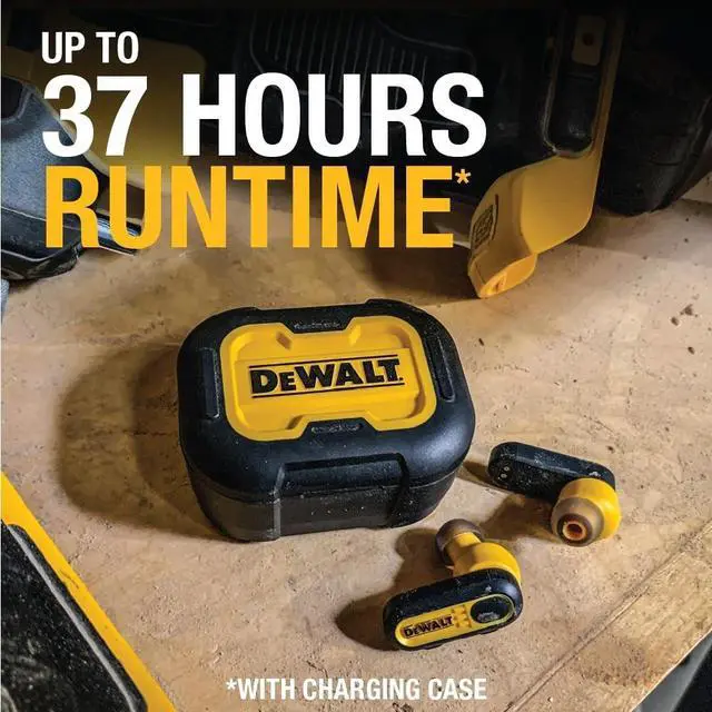 Special Edition Black Colorway: These black wireless Bluetooth earbuds make a bold statement on and off the jobsite. Sleek and professional, these earbuds are as sharp-looking as they are tough ^^ Listen All-Day With Up To 37-Hour Playtime Enjoy music and calls for up to 37 hours with wireless headphones that last almost an entire work week (with help from the durable charge case for on-the-go charging) ^^ Take Calls With Confidence Environmental Noise Control technology provides crystal clear calls even on the noisiest jobsites, making these the perfect earbuds for iPhone or Android users at work ^^ Never Miss A Beat These Bluetooth earbuds feature In-Ear Smart Sensors which auto play/pause your music whenever your earbuds are put in or removed from your ears ^^ Feel Protected Wherever You Listen With Dust/Water Resistance Rated IP56 for sweat and water resistance, these DEWALT headphones are ideal for dusty and sweaty work conditions