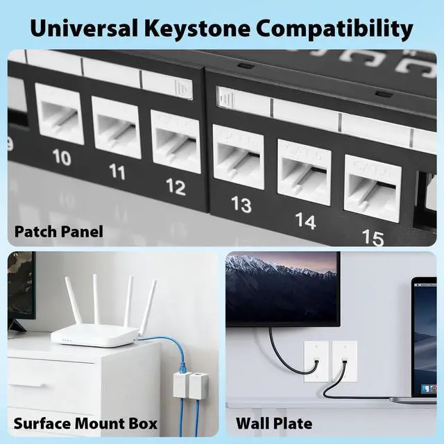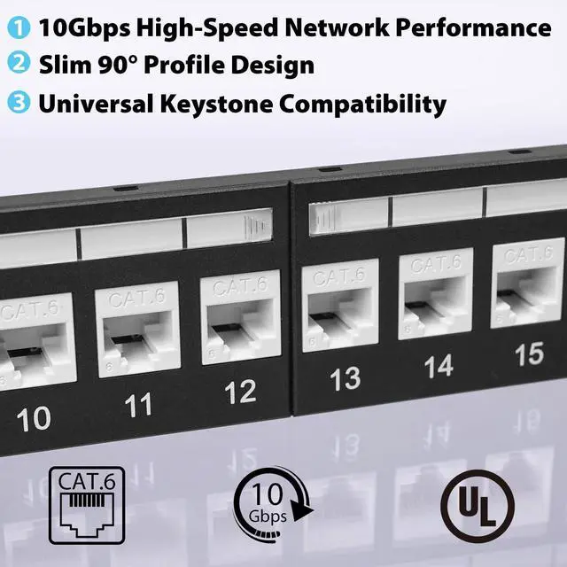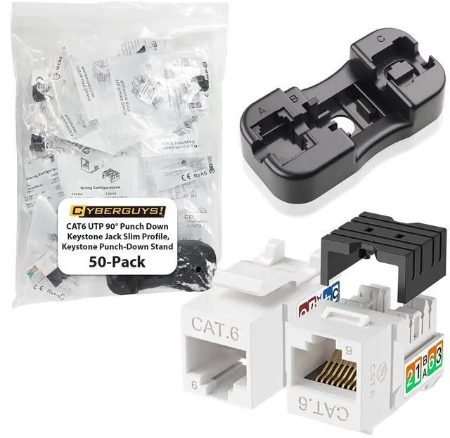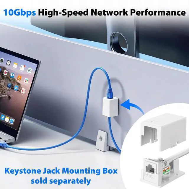 10Gbps High-Speed Network Performance Supports CAT6 keystone jacks Ethernet cabling with speeds up to 10Gbps, ensuring reliable, high-bandwidth connections for demanding networks ^^ Slim 90 Profile Design Space-saving, compact form factor ideal for tight installations in ethernet wall jack patch panels, surface boxes, or wall plates ^^ Universal Keystone Compatibility Works with standard keystone rj45 wall jack plates and panels, supporting 2326AWG conductors and cable OD range 5.59 mm ^^ UL Certified for Safety & Quality Built to meet UL performance and fire safety standards, ensuring reliable, long-lasting performance ^^ Durable Gold-Plated Contacts 50m gold-plated cat 6 connector offer superior conductivity and minimum 20 re-install cycles for professional-grade durability