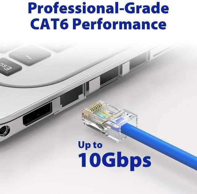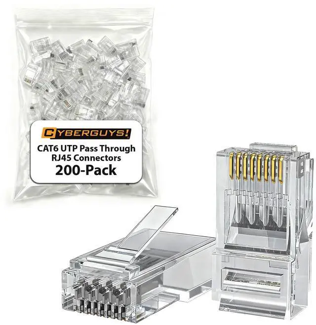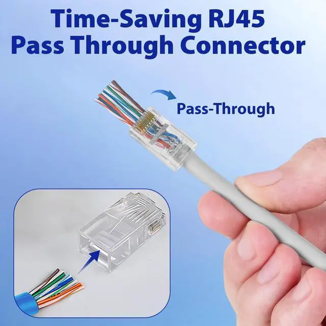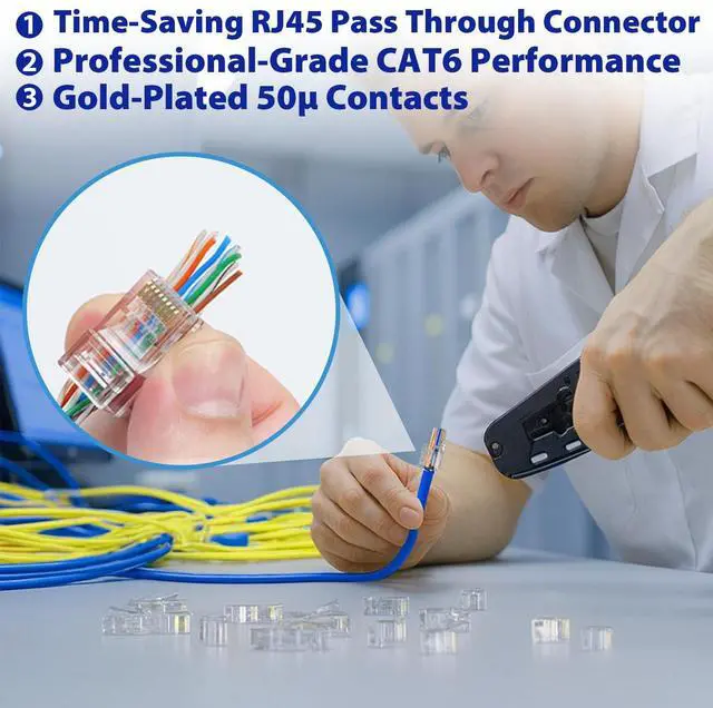 Time-Saving RJ45 Pass Through Connector Simplifies assembly by allowing wires to pass completely through the connector, ensuring accurate alignment and reliable terminations ^^ Professional-Grade CAT6 Performance Supports up to 10Gbps transmission speeds for unshielded twisted-pair (UTP) Ethernet cables, delivering superior network stability with cat 6 pass through rj45 connectors ^^ Gold-Plated 50 Contacts Provides enhanced conductivity and corrosion resistance, guaranteeing strong, long-lasting connections even under heavy use ^^ Compatible with 2426 AWG Cables Fits solid or stranded CAT 6/CAT 5e connectors (insulation OD range 0.9 - 0.98 mm), ensuring a secure fit and consistent signal integrity ^^ Value Pack with Storage Case Includes passthrough rj45 connectors in a portable zippered storage bag, perfect for professional installers and large-scale projects