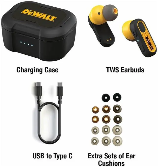 Special Edition Black Colorway: These black wireless Bluetooth earbuds make a bold statement on and off the jobsite. Sleek and professional, these earbuds are as sharp-looking as they are tough ^^ Listen All-Day With Up To 37-Hour Playtime Enjoy music and calls for up to 37 hours with wireless headphones that last almost an entire work week (with help from the durable charge case for on-the-go charging) ^^ Take Calls With Confidence Environmental Noise Control technology provides crystal clear calls even on the noisiest jobsites, making these the perfect earbuds for iPhone or Android users at work ^^ Never Miss A Beat These Bluetooth earbuds feature In-Ear Smart Sensors which auto play/pause your music whenever your earbuds are put in or removed from your ears ^^ Feel Protected Wherever You Listen With Dust/Water Resistance Rated IP56 for sweat and water resistance, these DEWALT headphones are ideal for dusty and sweaty work conditions