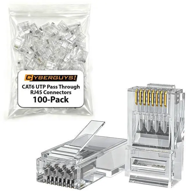 Time-Saving RJ45 Pass Through Connector Simplifies assembly by allowing wires to pass completely through the connector, ensuring accurate alignment and reliable terminations ^^ Professional-Grade CAT6 Performance Supports up to 10Gbps transmission speeds for unshielded twisted-pair (UTP) Ethernet cables, delivering superior network stability with cat 6 pass through rj45 connectors ^^ Gold-Plated 50 Contacts Provides enhanced conductivity and corrosion resistance, guaranteeing strong, long-lasting connections even under heavy use ^^ Compatible with 2426 AWG Cables Fits solid or stranded CAT 6/CAT 5e connectors (insulation OD range 0.9 - 0.98 mm), ensuring a secure fit and consistent signal integrity ^^ Value Pack with Storage Case Includes passthrough rj45 connectors in a portable zippered storage bag, perfect for professional installers and large-scale projects