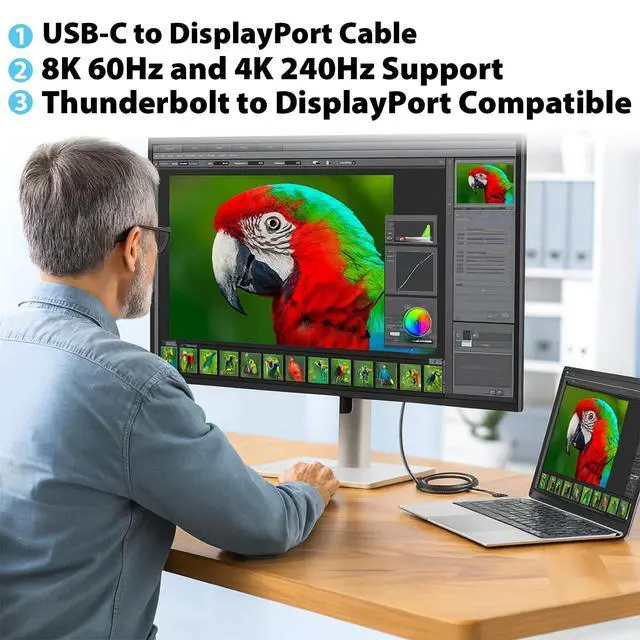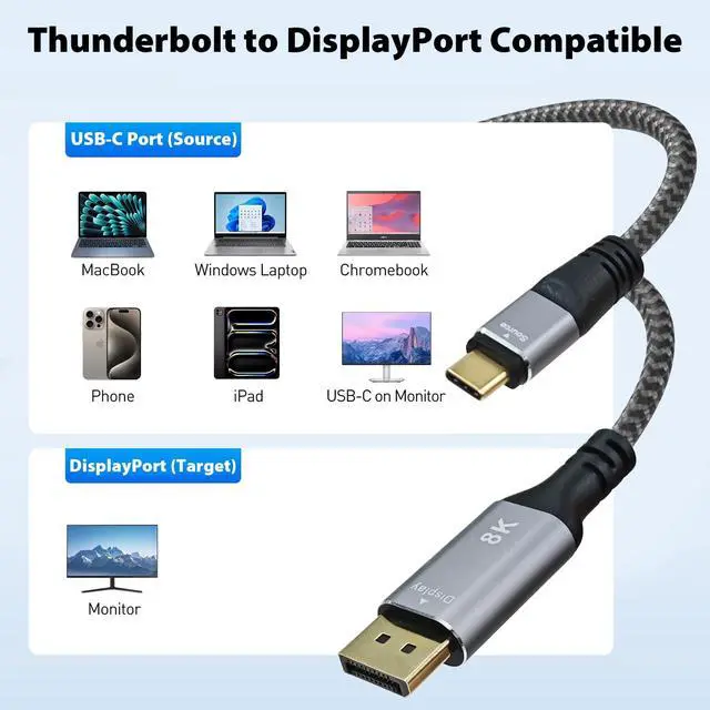 Unlock the full potential of your devices with the usb c to display port 1.4 cable, engineered for ultra-high resolution and refresh rate support. Connect your MacBook Pro/Air, iPad Pro, Dell XPS, HP Spectre, Surface, and more directly to DisplayPort monitors and projectors using this dp to usb c adapter. Enjoy stunning 8K video at 60Hz or fluid 4K at 240Hz performance for lag-free thunderbolt 4 to displayport gaming, video editing, and professional workloads. This usbc to displayport cable supports Mirror Mode for big-screen projection and Extended Mode for multitasking.