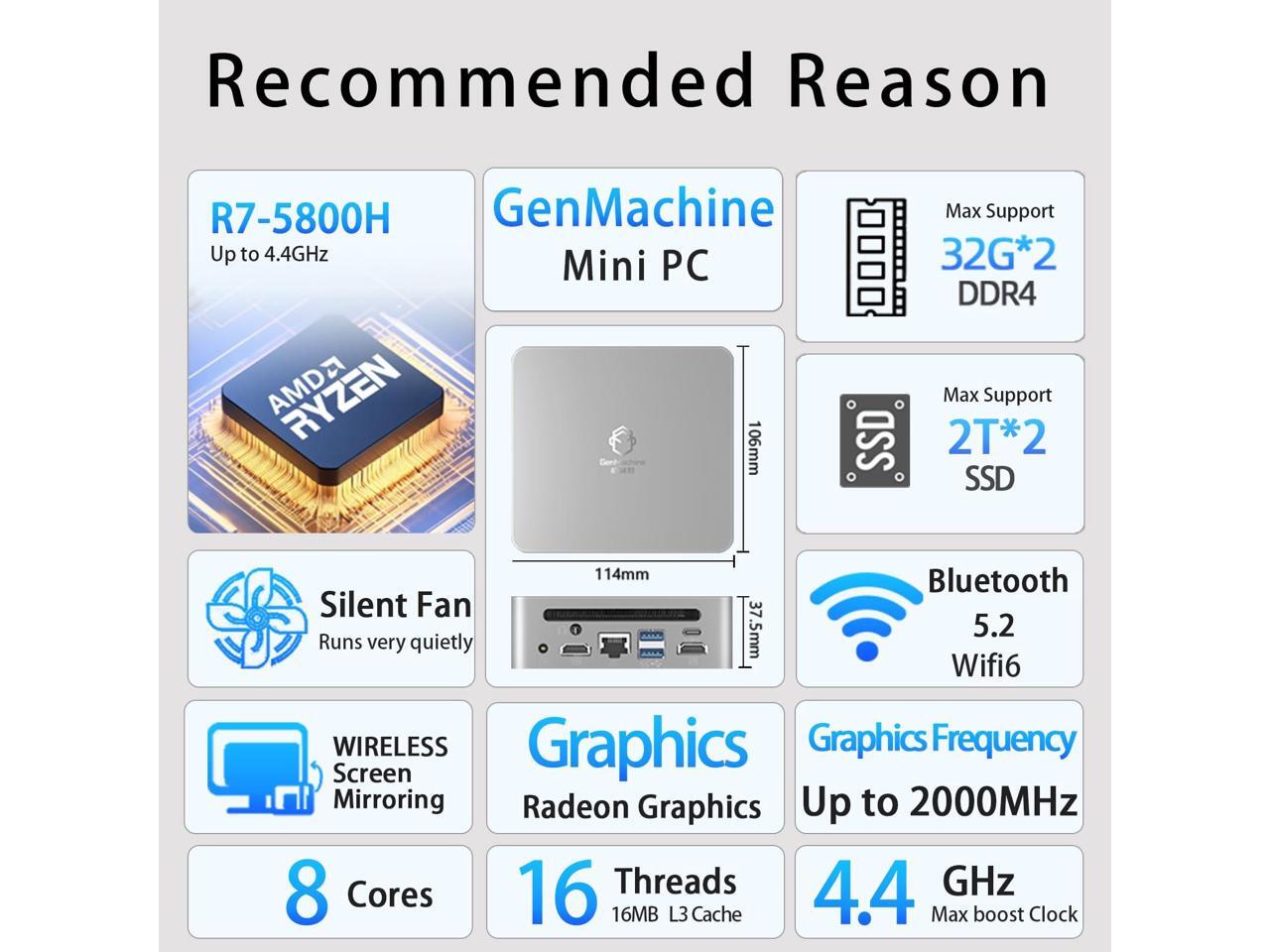 GenMachine Mini PC AMD Ryzen 7 5800H Mini Computers Up to 4.4GHz 8c/16t, 32GB DDR4, 1TB SSD & M.2 NVME, Gaming PC with Wifi6/BT5.2/DHMI/DP, Gaming/Office/Design