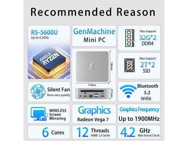 GenMachine Mini PC AMD Ryzen 5 5600U Mini Computers Up to 4.2GHz 6c/12t, 16GB DDR4, 512GB SSD & M.2 NVME, Gaming PC with Wifi6/BT5.2, Gaming/Office/Design