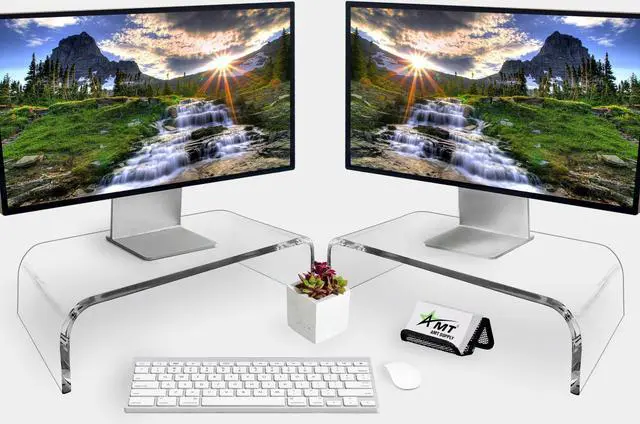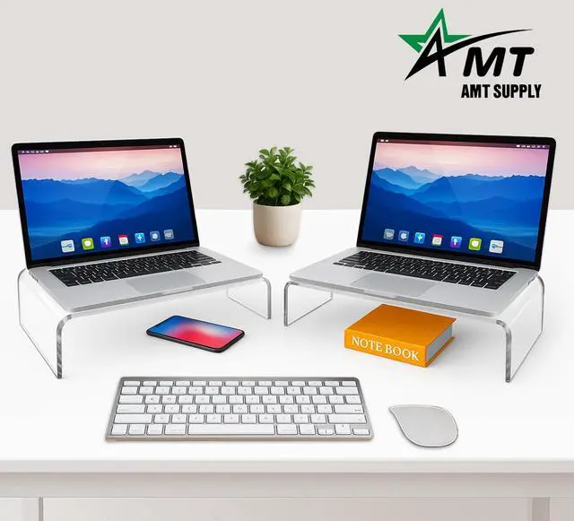 DURABLE: The AMT Acrylic Monitor Stand is crafted from durable Class-A Acrylic, surpassing the sturdiness of wood and offering a lighter alternative to fragile glass stands. It confidently supports devices up to 50 Ib, serving as an ideal TV riser, reliable monitor base, space-saving printer stand, and practical desktop shelf for books and accessories.