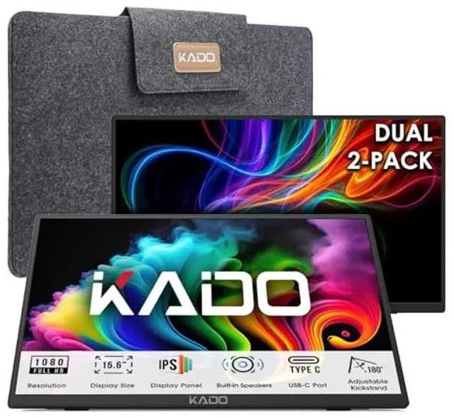 Kado Dual Portable Monitor Setup - 2-Pack 15.6" 1080p IPS Triple Monitor Extender for Laptop, 1920x1080 HDMI USB-C 180deg Kickstand Built-in Speakers, Stacked Desktop Setup Office Gaming Daytrading
