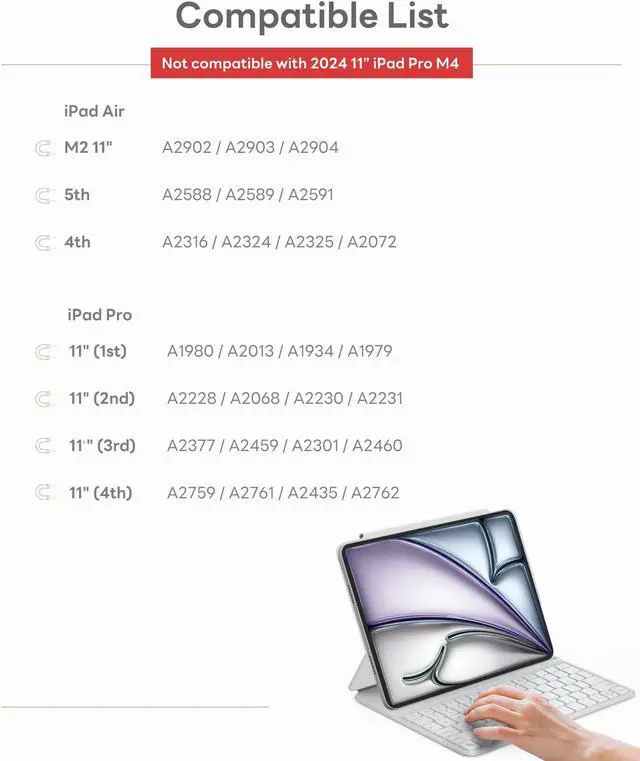 [(Compatible iPad models)] - Apple iPad Air M2 11'/5/4 & Pro 11' 1-4th Generation. Please confirm whether your iPad is compatible with eiP Keyboard case before you place orders. Not compatible with 2024 iPad Pro M4 11"