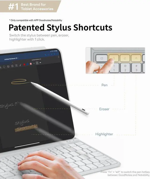 [(Patented stylus shortcuts)] - Quick shortcuts let you switch between pen, eraser, and highlighter while note-taking, boosting your efficiency for your apple pencil. It's only for app "Goodnotes" and "Notability". Press "Fn" + "eiP" to switch the pen hotkey between GoodNotes and Notability.