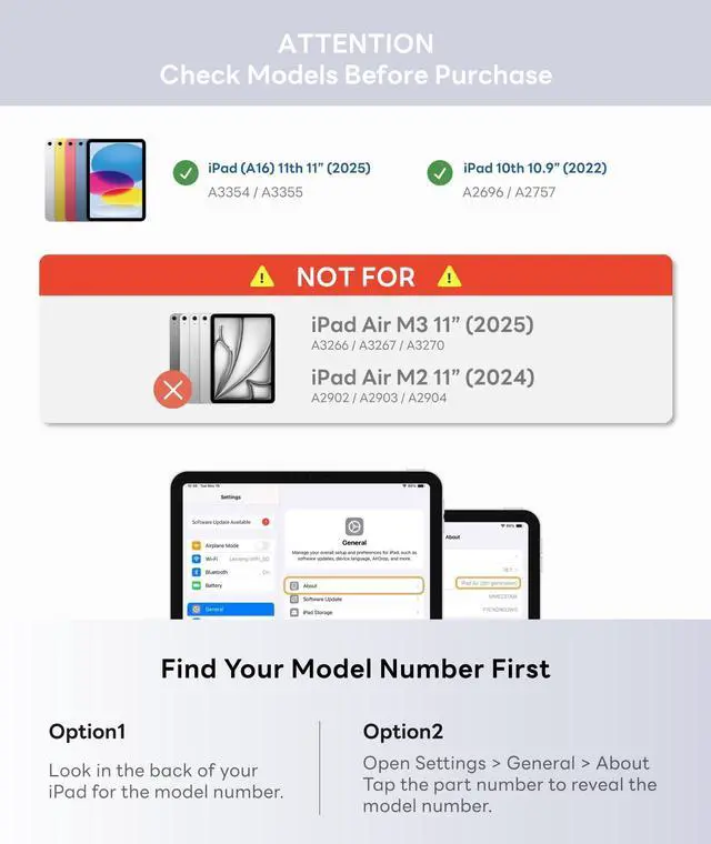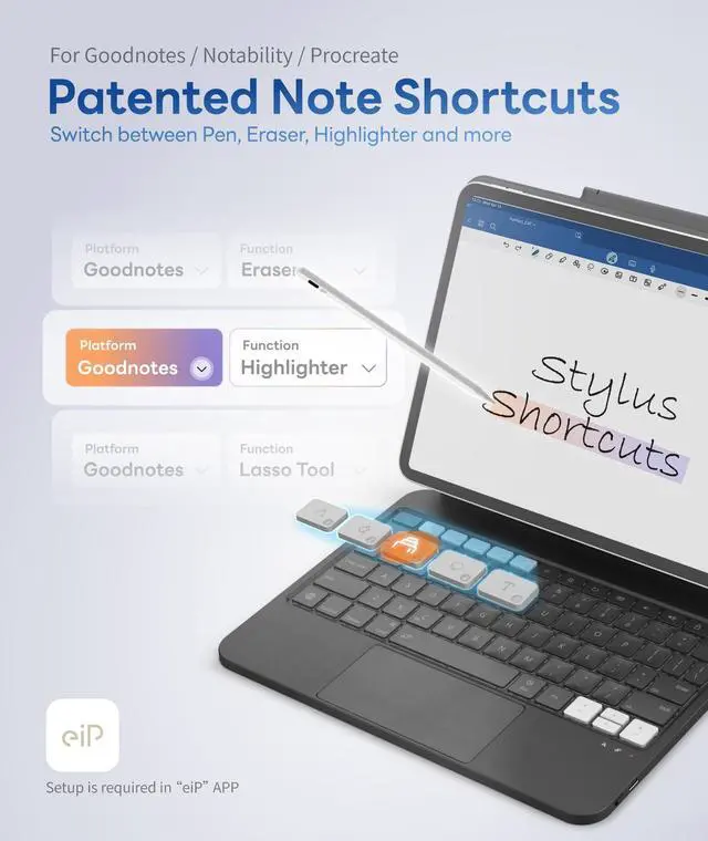 Find Your Model: Setting General About Model Name and number. Please check your iPad model before purchase. Bluetooth Connect ^^ Custom Shortcuts Patented Design & Industry-first. Speed up your workflow with customizable shortcuts. Assign one-tap actions for your favorite note-taking apps (Goodnotes / Notability / Procreate)including pen, highlighter, eraser, text, etc. You can also set shortcuts for general functions such as undo/redo, brightness, screenshot, mute, and more. Perfect for note-taking, editing, and everyday navigationallowing you to switch modes instantly without lifting your hands from the keyboard. ^^ Full-Area Control Trackpad- Unlike others with only two-point activation, enjoy a full-surface, multi-gesture trackpad that feels natural and precise. Tap, scroll, swipe, and pinch-to-zoom smoothly for true laptop-like control on your iPad. You can also press Fn + Space to disable the trackpad and avoid accidental touches. *How to tap to click: Setting >General > Trackpad > Turn on Tap to Click ^^ Dedicated Pen Sleeve- Keep your stylus secure and ready to go. The integrated pen sleeve protects your stylus in transit and reduces the chance of drops, so your pen stays safe in your bag or on the move. ^^ Secure Magnetic Buckle-Snap, Secure, and Store Experience a secure snap with superior protection. Our innovative buckle design doubles as a stylus sleeve, keeping your pen safely stored while firmly locking the keyboard case shut. No more loose accessories or accidental openings. ^^ Easy to Carry- Snap on magnetically in secondsno tools, no fuss. The slim, travel-ready design slips easily into your backpack and is ideal for coffee shops, libraries, classrooms, or the office. ^^ Reinforced Hinge Stand-Type or watch comfortably with an aluminum floating cantilever hinge. It holds your iPad at stable viewing angles and is tuned to resist sagging during everyday use.