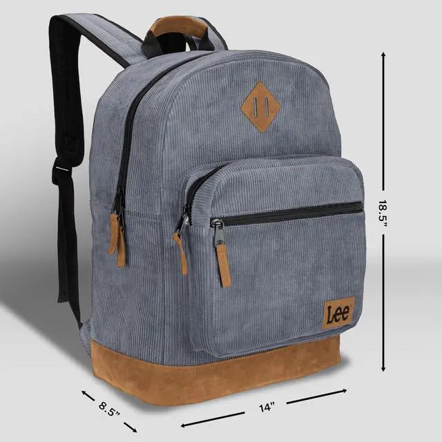 Lee Grey Corduroy Backpack for Boys and Girls, Authentic Jeans Company Study Daypack with Padded Laptop Sleeve Fits 15.6 Inch Notebook