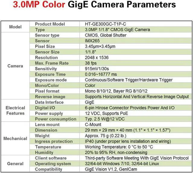 HTENG VISHI GigE Ethernet 3.0MP 1/1.8" Color Industrial Camera Machine Vision Global Shutter C-Mouth CMOS Area Scan Camera 2048X1536 38FPS Indoor