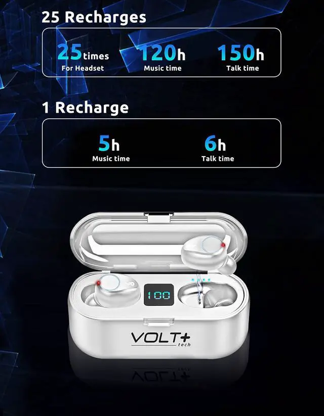 VOLT PLUS TECH Wireless Bluetooth Earbuds Compatible with iPhones/Motorola Phones & Google Pixel Phones /IPX7 Waterproof Noise Canceling Earbuds LED Display Quad Mic 8D Bass & 2000mAh PowerBank Case
