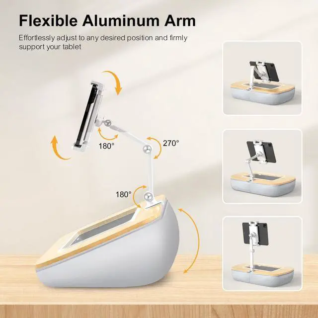 ^^ Sturdy and Durable: Designed with flexible aluminum arms, 360 swivel rotation bracket, 270 foldable middle axis and and 180 foldable bottom axis. Elevate your screen to the perfect viewing height.