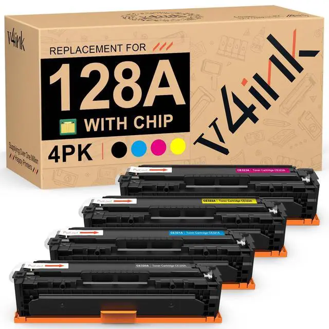 [Green for the Planet] Recycled and remanufactured from empty OEM cartridges, 100% match printer structure, more easily recognized and help to reduce landfill waste. ^^ [Package Includes] 4 packs (Black, Cyan, Magenta, Yellow) v4ink 128A CE320A CE321A CE322A CE323A remanufactured toner cartridges with chip ^^ [Compatible Printer List] LaserJet CP1525n/CP1525nw, LaserJet Pro CM1415fn MFP/CM1415fnw MFP ^^ [Print more and cost less] Prints 2, 400 Pages per Black cartridge; 1, 800 Pages per Cyan/ Yellow/ Magenta Cartridge at 5% coverage (Letter/A4) ^^ [True-to-life Colors] Refilled with premium toner formula, v4ink remanufactured cartridges print true-to-life colors, give your printed documents a professional and impactful touch at affordable input.