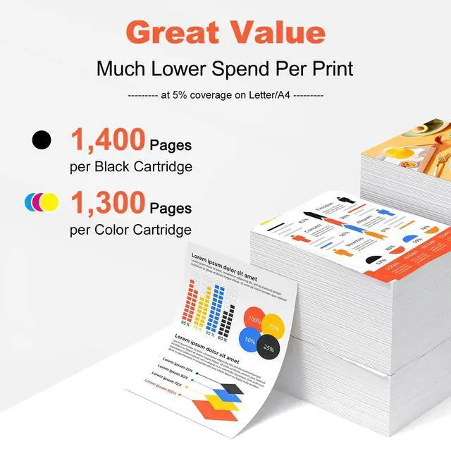 Less: 1, 400 pages per Black cartridge and 1, 300 pages per Cyan Magenta Yellow cartridge at 5% coverage (Letter/A4).