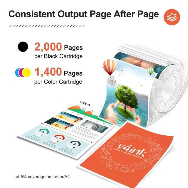 Print more and cost less: 2, 000 Pages per Black cartridge, 1, 400 Pages per Cyan/Yellow/Magenta Cartridge at 5% coverage (Letter/A4) ^^ Suitable for