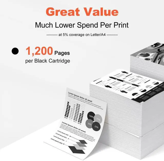 Print more and cost less: 1, 200 Pages per Black cartridge at 5% coverage (Letter/A4) ^^ Suitable for