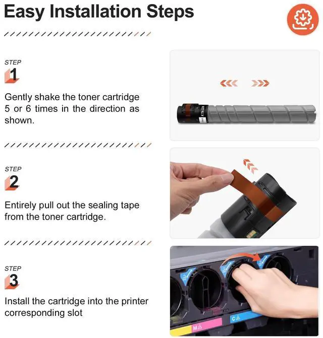 Compatible with: Konica Minolta Bizhub C258 C308 308 308E C368 368 368E C454 454E C458 458 458E C558 558 558E C658 658E printers ^^ Perfect partner with your printer. Easy to be installed and recognized ^^ V4ink TN324 TN-324 compatible toner cartridge is designed to offer a low-cost but high-quality product for your printing.