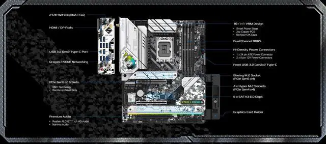 Supports 13th Gen & 12th Gen Intel® Core Processors 16+1+1 Phase Power Design, SPS for VCore+GT 4 x DDR5 DIMMs, supports up to 6800+ (OC) 1 PCIe 5.0 x16, 1 PCIe 4.0 x16, 1 PCIe 3.0 x16, 1 M. 2 Key-E for WiFi
