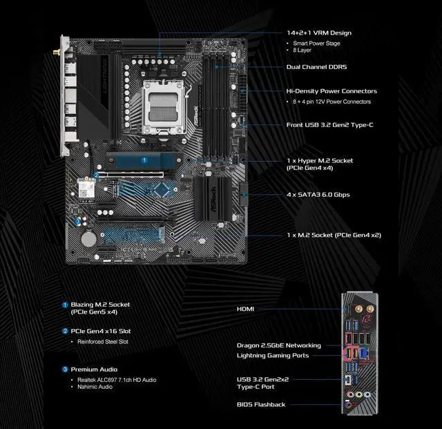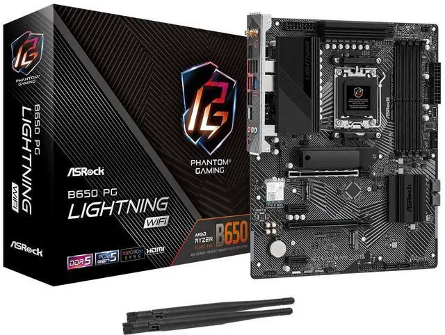 The ASRock B650 PG Lightning WiFi is a performance-focused ATX motherboard designed for the AMD AM5 platform, supporting the latest Ryzen 9000, 8000, and 7000 Series processors. Built with a premium 14+2+1 phase power design and Smart Power Stage technology, it delivers unwavering stability for overclocking and intensive workloads. With support for high-speed DDR5 memory up to 7200+ (OC), this board provides the foundation for a responsive and powerful gaming or content creation system. Experience next-generation speed with a dedicated PCIe Gen5 M. 2 slot for the fastest available SSDs, complemented by additional PCIe 4.0 M.