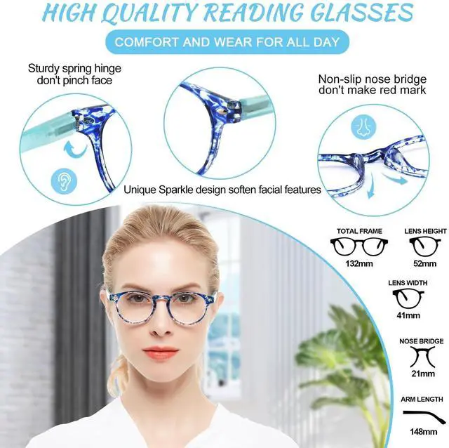 • Size:Frame width-5.27(132MM ),Lens width-2.1(52MM), Lens height-1.61(41MM), Bridge-0.91(23MM), Frame length-5.8(148MM),. These blue blocker with round design is suitable for Medium face or petite face and makeup, and against the high energy blue light from digital screens (computer, phone, pad, TV, LED, etc.)