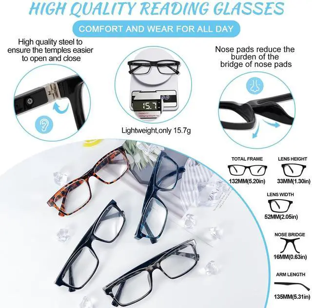 Fashion glasses size: Lens width- 2.12, Lens height- 1.65, Bridge- 0.71, Frame width- 5.39, Frame length- 5.35, This stylish reading glasses 2.25 for men with A-class high-definition blue light blocking Lens makes the vision clear, anti-fatigue and anti-glare and scratch resistant. ^^