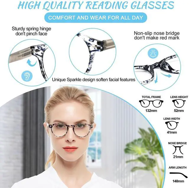 • Size:Frame width-5.27(132MM ),Lens width-2.1(52MM), Lens height-1.61(41MM), Bridge-0.91(23MM), Frame length-5.8(148MM),. These blue blocker with round design is suitable for Medium face or petite face and makeup, and against the high energy blue light from digital screens (computer, phone, pad, TV, LED, etc.)
