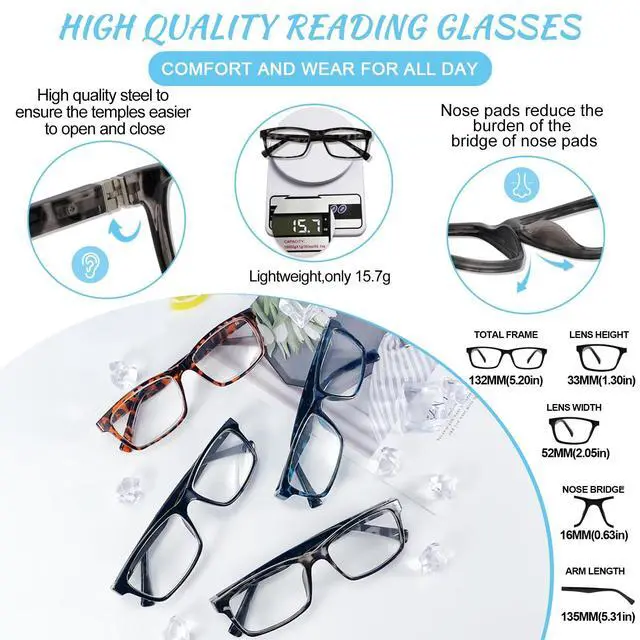 Fashion glasses size: Lens width- 2.12, Lens height- 1.65, Bridge- 0.71, Frame width- 5.39, Frame length- 5.35, This stylish reading glasses 6.0 for men with A-class high-definition blue light blocking Lens makes the vision clear, anti-fatigue and anti-glare and scratch resistant. ^^