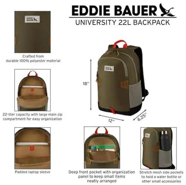 The Eddie Bauer University Backpack (22L) is the perfect blend of practicality, organization, and comfort, designed to support s, professionals, and daily commuters. Its large main compartment includes a padded laptop sleeve, ensuring secure storage for your tech essentials. A deep front pocket with an organization panel helps keep small accessories like keys, pens, and chargers neatly arranged, while two stretch mesh side pockets offer quick access to water bottles or other daily necessities. Lightweight yet durable, this backpack is built for all-day comfort, making it an excellent choice for, work, or everyday use.