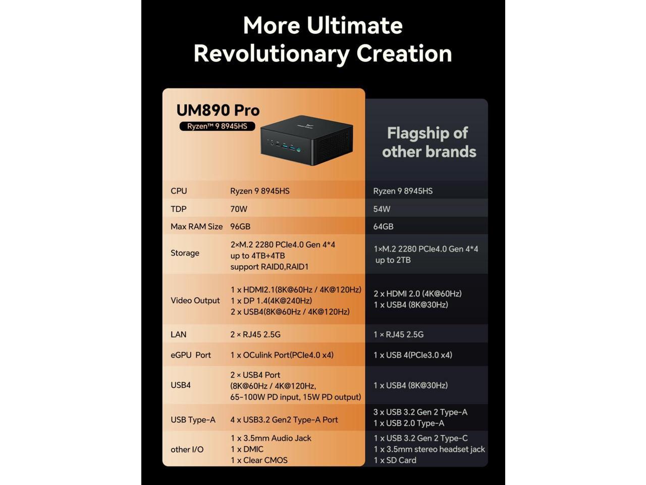 - [(Quad-Screen Display)] UM890 Pro mini pc 8945HS is equipped with HDMI 2.1, DP 1.4 , and 2 x USB4, supporting maximum resolution of 8K at 60Hz/4K at 144Hz, providing a v