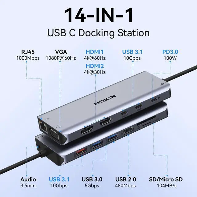 [(14-in-1 USB C Docking Station )] : This docking station dual monitor , 2 HDMI, VGA, Gigabit Ethernet, 1 USB 3.1, 2 USB3.0 and 1 USB 2.0 ports, USB C power charging port (max. 100W), SD/Micro SD card reader, and 3.5mm microphone/audio. In addition, this docking station 2 HDMI does not require any driver installation and is plug-and-play for your daily use