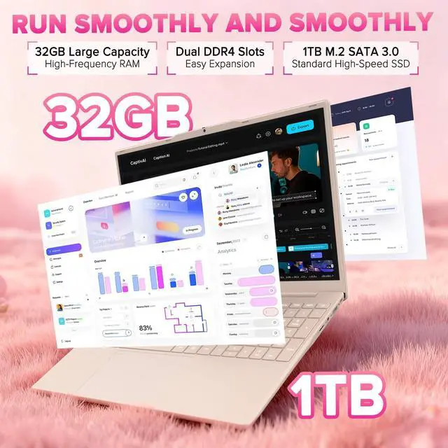 Efficient N5100 Processor: Quad-core ( 1.1GH z base, up to 2.8GH z turbo) for stable daily tasks (office, online learning, video calls, browsing) with low-power balance of performance and battery life ^^ 32GB DDR4 RAM + 1TB