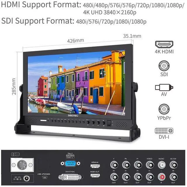Angle: 80/80(L/R) 60/80(U/D)SDI Support Format480i/576i720p(60/ 59.94 /50/30/29/25/24/ 23.98 )1080i(60/ 59.94 /50)1080p(60/ 59.94 /50/30/ 29.97 /25/24/24sF/ 23.98 / 23.98 sF)4K UHD 38402160p (30/ 29.97 /25/24/ 23.98H z), 40962160p (24Hz) HDMI Support Format480i/576i/480p/576p1080i (60/ 59.94 /50)720p (60/ 59.94 /50/30/29/25/24/ 23.98 )1080p (60/ 59.94 /50/30/ 29.97 /25/24/24sF/ 23.98 / 23.98 sF)4K UHD 38402160p (30/ 29.97 /25/24/ 23.98H z), 40962160p (24Hz) Package Included1* P173-9HSD Camera Monitor1* Mini HDMI Cable1* Sunshade1* U bracket1* Tally Kit1* 3A DC Power Adapter1* V-Mount Battery Plate1* Operation Manual
