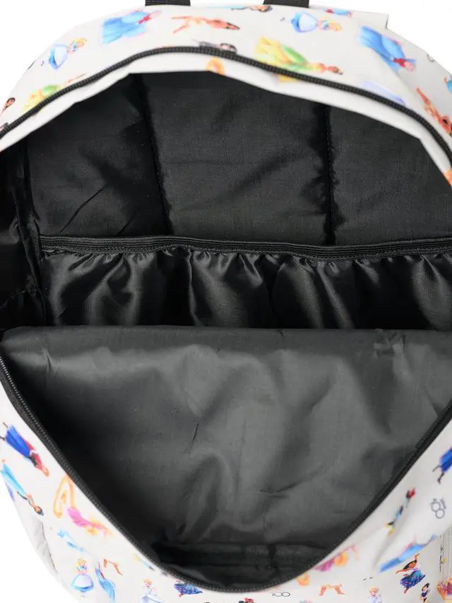 Disney 100 cargo backpack - officially licensed. All over print with Minnie Mouse, Snow White, Tiana, Moana, Jasmine, Rapunzel, Cinderella, Fairy Godmother, Elsa, Anna, Alice in Wonderland, Mirabel and Edna celebrating Disney's 100th anniversary. Well constructed and comfortable - designed in durable fabric. There is an inside laptop padded sleeve/pocket. Backpack also has adjustable padded shoulder straps, double zipper opening, top handle, front cargo pocket and padded back. Wipe clean with damp cloth and air dry. For big kids, pre-teens, teenagers and adults.
