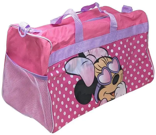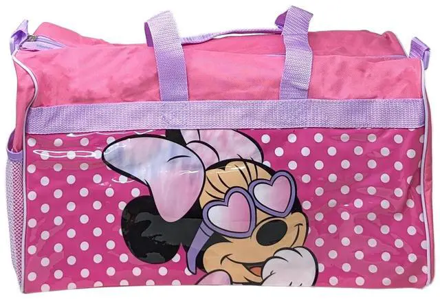 The Minnie Mouse Pink Polka Dot Duffle Bag is perfect for little Disney fans. This delightful bag features a fun design with Minnie Mouse sporting heart sunglasses, set against a pink polka dot background. The spacious main compartment easily accommodates clothes, toys, and other travel essentials. With dual carry handles and a purple shoulder strap, this bag offers versatile carrying options. Lightweight and durable, it's perfect for kids on the go. The easy-to-clean surface ensures hassle-free maintenance, making it ideal for any adventure.