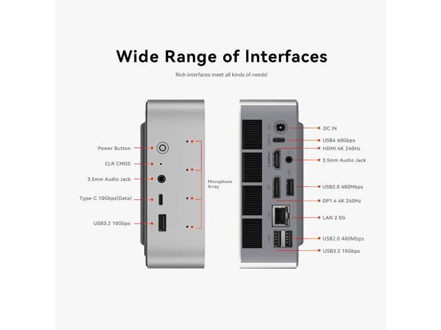 - [(Compact & Rich Interface & Built in Power supply unit)] Easy to setup and small in size. WiFi 6 (802.11ax) , Bluetooth 5.2 is faster and more stable. Gigabit Ethernet RJ45 2.5G network connectivity. Beelink SER9 is equipped with 1xDP, 1x HDMI, 1x USB4, 2x USB3.2, 2x USB2.0, 1x Type-c(data), 1 xGigabit Ethernet lan, 3.5mm Audio Jackx2.