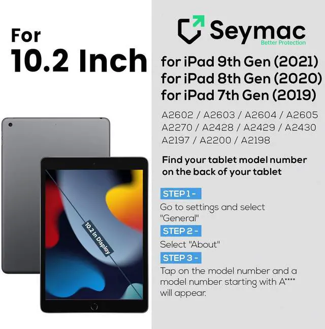 Compatibility: Only fits for iPad 9th/ 8th/ 7th Generation 10.2 inch (Model: A2602 A2603 A2604 A2605 / A2197 A2198 A2200 / A2270 A2428 A2429 A2430); please kindly check the model number on the back of your tablet (''Axxxx'') before purchase.