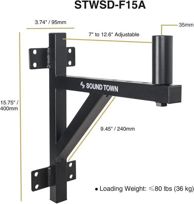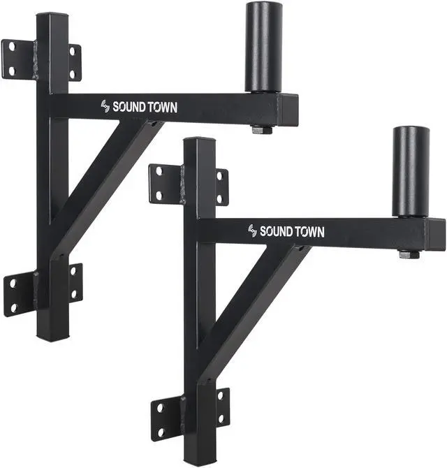 The Sound Town STWSD-F15A-PAIR is a 2-pack speaker mounts that can safely hang speakers on flat wall surfaces. Each bracket comes with heavy-duty steel construction and up to 80 lbs. maximum weight capacity. FEATURES 2-pack wall mount speaker brackets Securely hangs speakers on flat wall surfaces, fits 35mm speaker mounts Each speaker bracket supports up to 80 lbs. Heavy-duty steel construction SPECIFICATIONS Package Weight 11.6 lbs Package Dimensions 16.5 x 16.3 x 5.9 â??