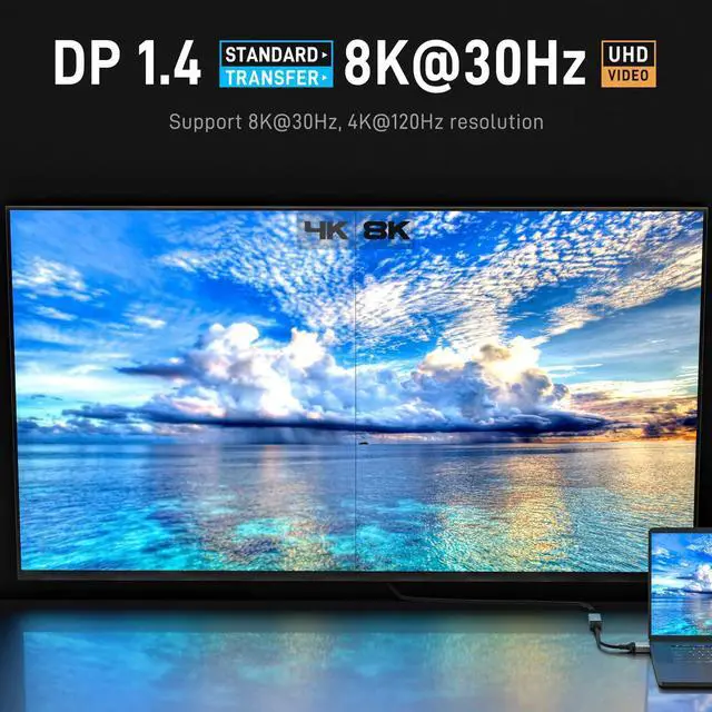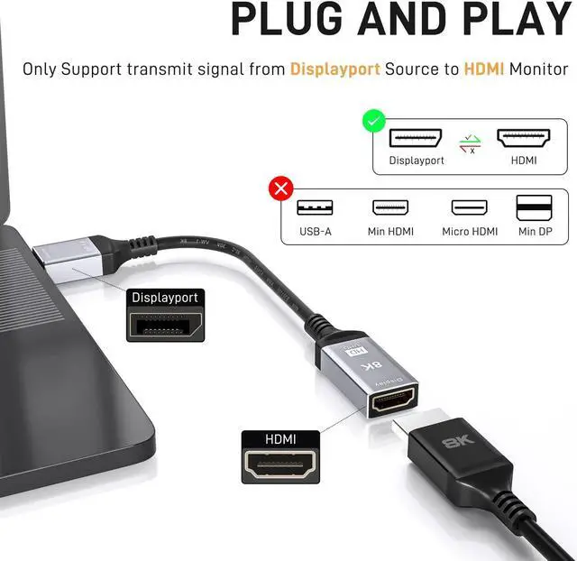 Ultra HD 8K 30HZ with the Directional DP male to HDMI female adapter, you can easily output 8K@30Hz or 4K@120Hz video and output in your external displays, which allows you to enjoy a smooth and tear-free immersive experience. If you would like to output 8k@30hz or 4k@120hz in your tv or monitors, please make sure your laptops, monitors and HDMI cable all support 8K@30Hz or 4k@120hz. : The length of the HDMI cable shouldn't exceed 2M to reach the best peroformance of the DP to HDMI adapter.