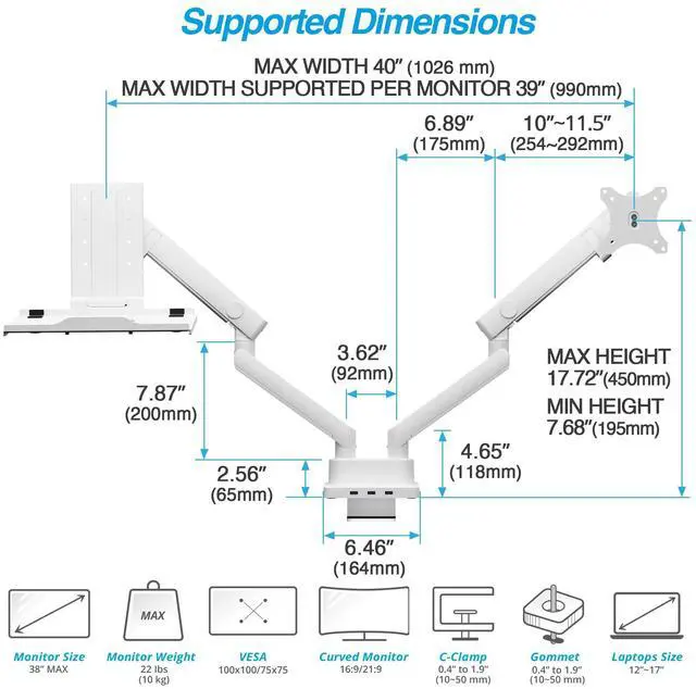 Dual Arm Mount With Laptop Tray: Heavy-duty mechanical spring arms support a monitor and an adjustable laptop tray; includes quick-release VESA plate for easy installation.