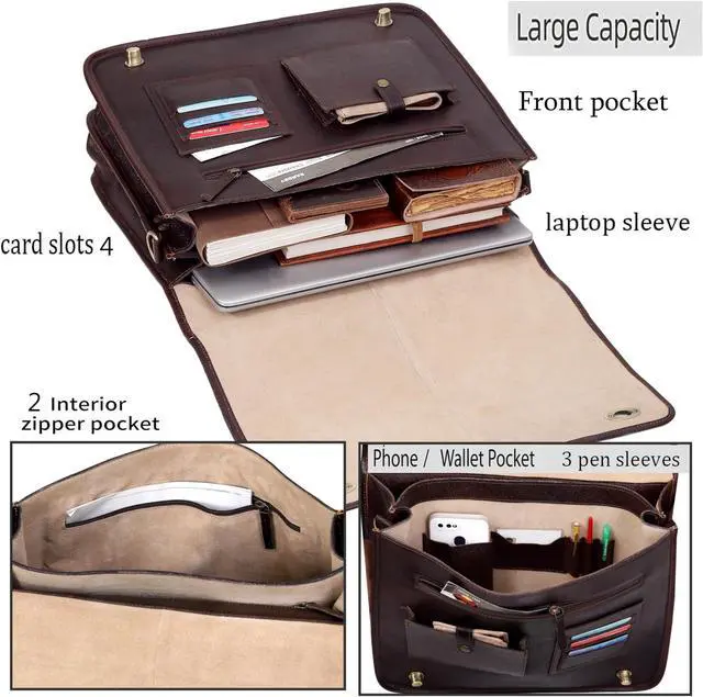 SPACIOUS & STYLISH: This Leather briefcase sized 16"x6"x12" (L x W x H) is quite spacious & its storage volume is extendable as per your needs due to its roll-top design which makes it ideal for daily usage, short trips, and outdoor activities. The bag includes multiple pockets both inside and outside, and features a padded shoulder strap that can be adjusted for length.