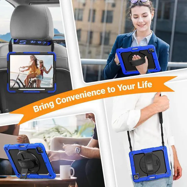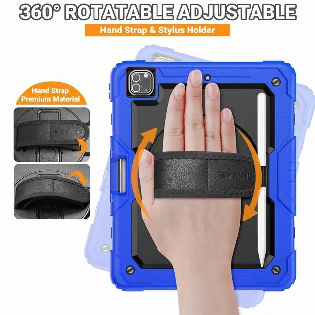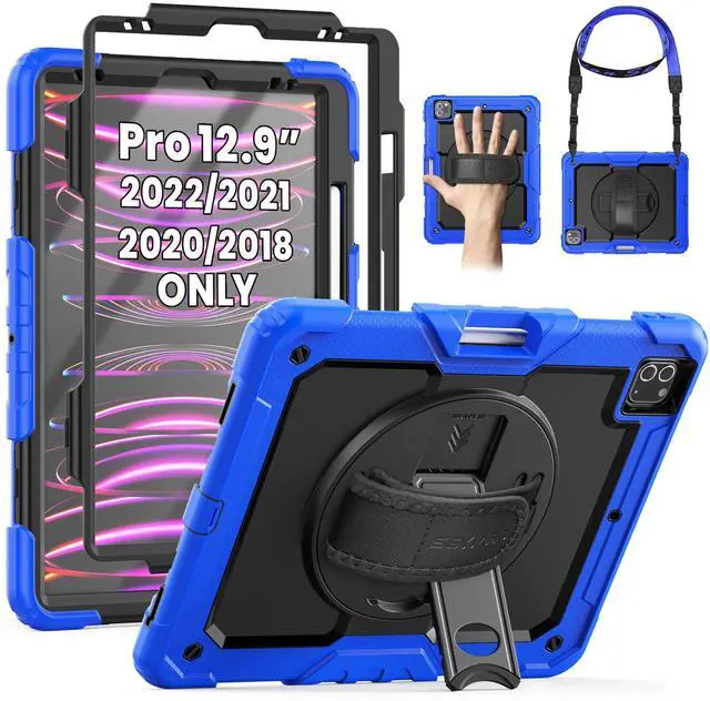 SEYMAC for iPad Pro 12.9 Case 2022/2021/ 2020/2018, Heavy Duty Protection Shockproof Case with Screen Protector, 360° Rotating Stand/Handle/Shoulder Strap, Supports Pencil 2 Charging, Blue