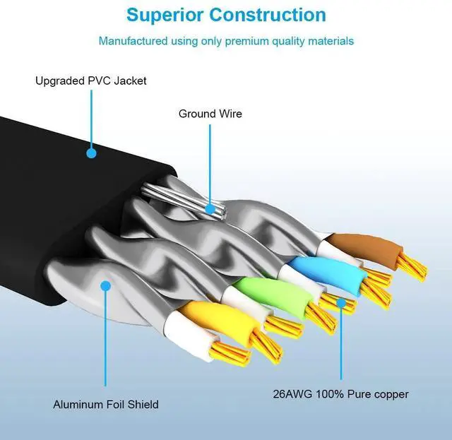 PREMIUM CONSTRUCTION: Made of 4 Pairs 100% 26WAG pure and thick shielded twisted pair (STP) of copper wires which provide better protection from crosstalk, noise, degrade the signal interference. Shielded RJ45 connectors with 50 micron gold-plated contacts ensure corrosion resistance & long-term performance (without noise or signal loss).