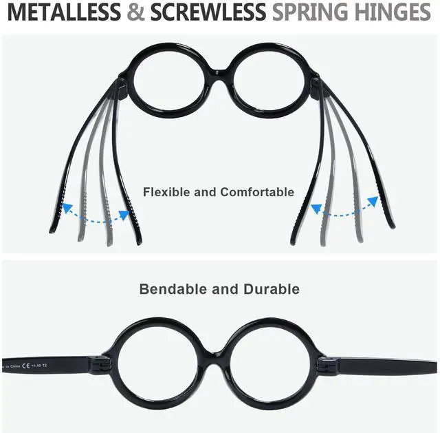 ENHANCED DURABILITY: With the metalless and screwless design, the arms can be opened super wide absolutely without an issue, so you don't need to worry about breaking the temples by accident when you open them too wide. You also don't need to worry the screws keep falling out. CessBlu stylish large round readers are durable and sturdy.