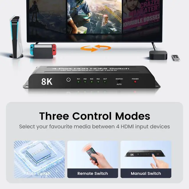 8K HDMI 2.1 Switch 4 in 1 out: This HDMI 2.1 switcher 4 in 1 out supports connecting 4 port HDMI devices to 1 HDMI display, making it easy to seamlessly switch between multiple HDMI sources, allowing you to easily connect and switch between devices such as gaming consoles, streaming media devices and Blu-ray players for your entertainment convenience. Avoid frequent plugging and unplugging by switching with the buttons on the remote control or 8K@60Hz HDMI switcher.