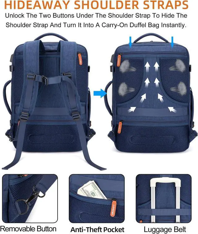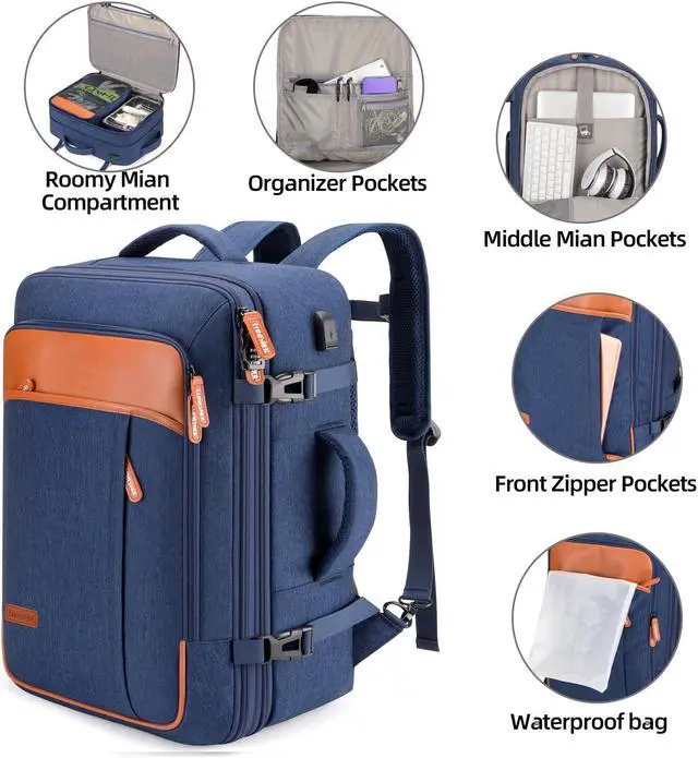 LARGE CAPACITY & EXPANDABLEThis extra large travel backpack with expandable feature offers you more packing capacity up to 42L.One separate laptop compartment hold 17 Inch Laptop as well as laptop accessories,textbooks.One spacious packing compartment roomy for daily necessities,clothes.Front zipper pocketx2,side pocket for water bottle or umbrella,back anti-theft zipper bag which can store valuables such as mobile phone or cards.These small designs keep your items neat and easier to find