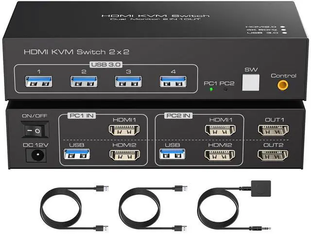 KVM Switch 2 Monitors 2 ComputersThis HDMI KVM Switch supports two PCs to share dual monitors and four sets of USB 3.0 devices.Easily switch between two computers without repeatedly plugging and unplugging cables, making your desktop neater and improving your work efficiency and usage experience.Note:Both of your two computers need to have two HDMI output ports, and both monitors need to have HDMI interfaces