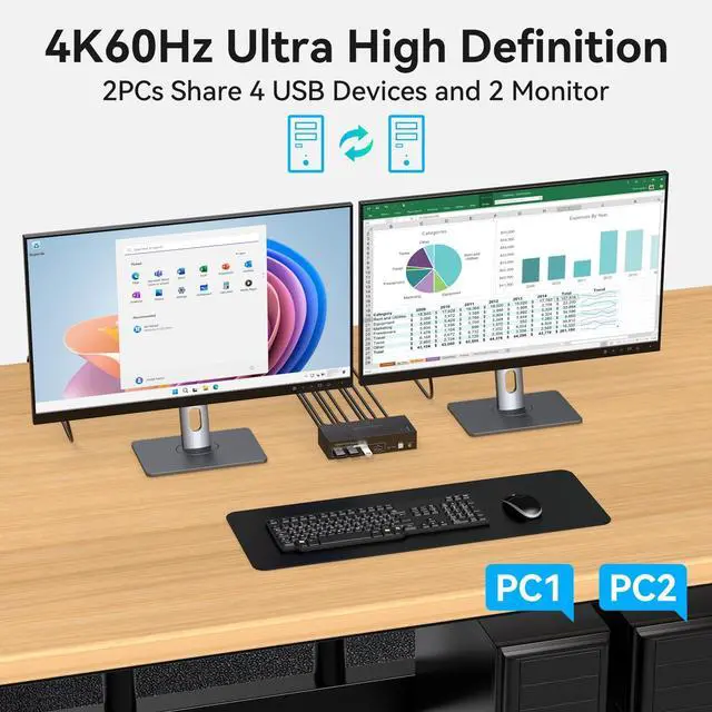 4K60Hz SwitchThis 4K Dual Monitor KVM Switch supports a resolution of up to 4K60Hz and can transm