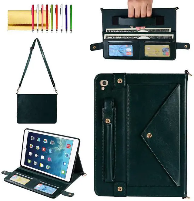 Handbag Case for 9.7-inch iPad 2018 2017 (iPad 5th/6th Generation), iPad Air/Air 2 Case, Techcircle Folio Stand PU Leather Crossbody iPad Cover with Hand Strap, Pen Holder Wallet Case, Midnight Green